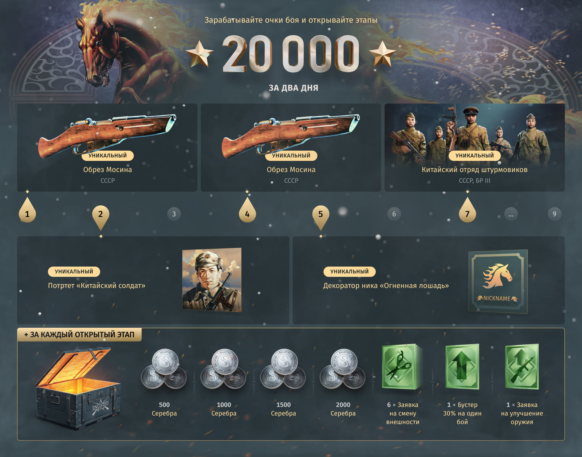- С 7 марта по 9 марта (16:00 МСК), после окончания события, будет доступна возможность приобрести недостающие награды.